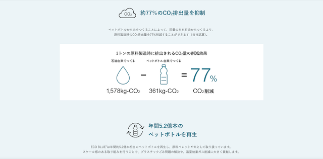 來自寶特瓶回收抽紗製成,比起傳統石油製布料,減少 77% 的 CO₂ 排放。