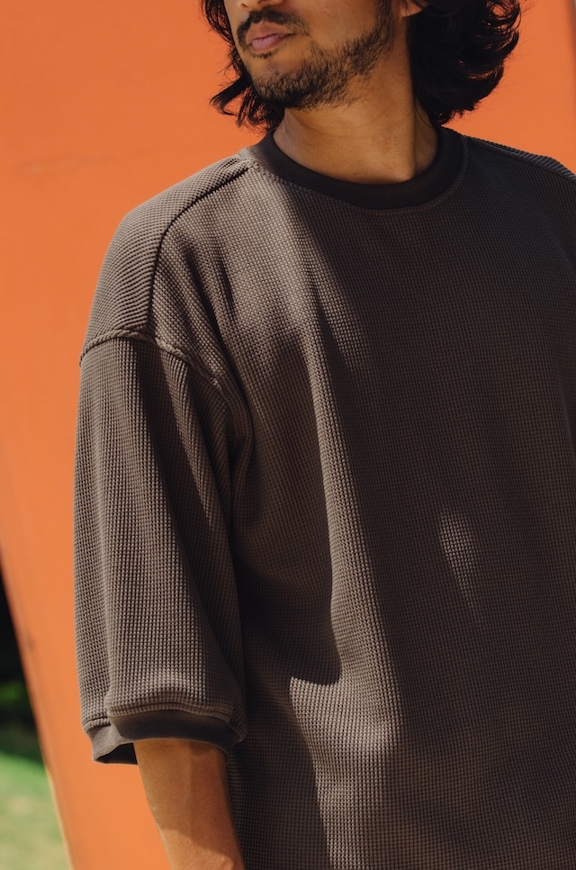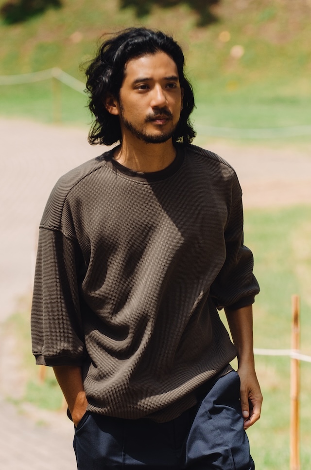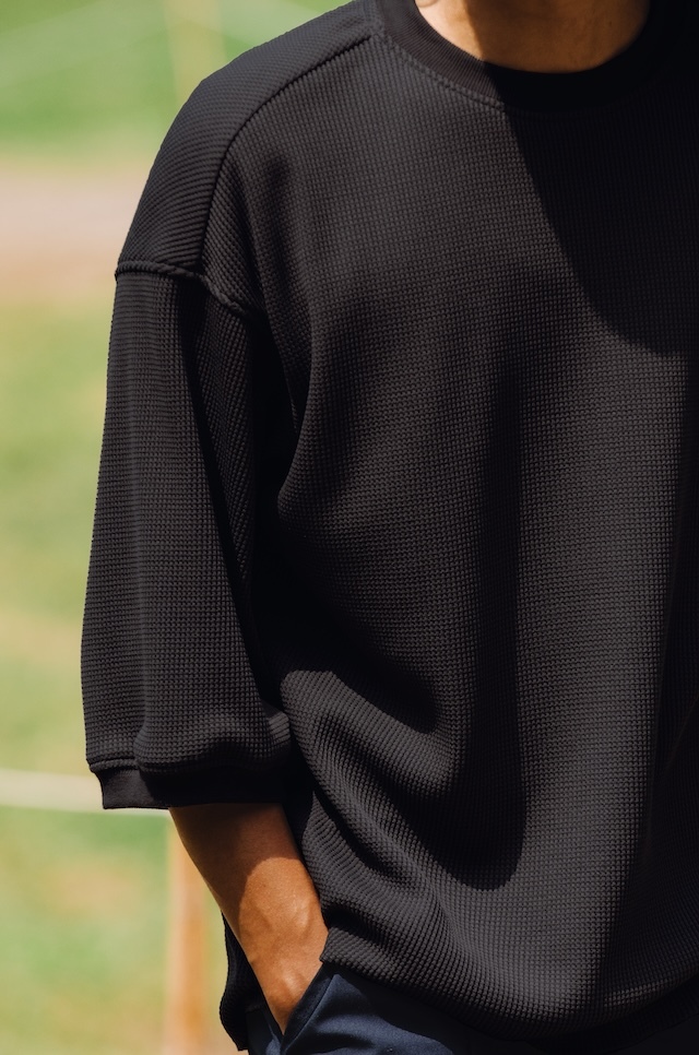 獨特組織讓外表看起來有厚實感,實際上是輕薄、柔軟、透氣、快乾,適合外出著用的六分袖上衣。