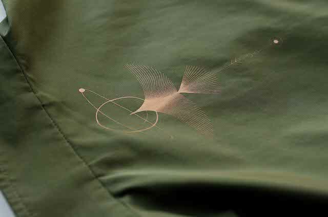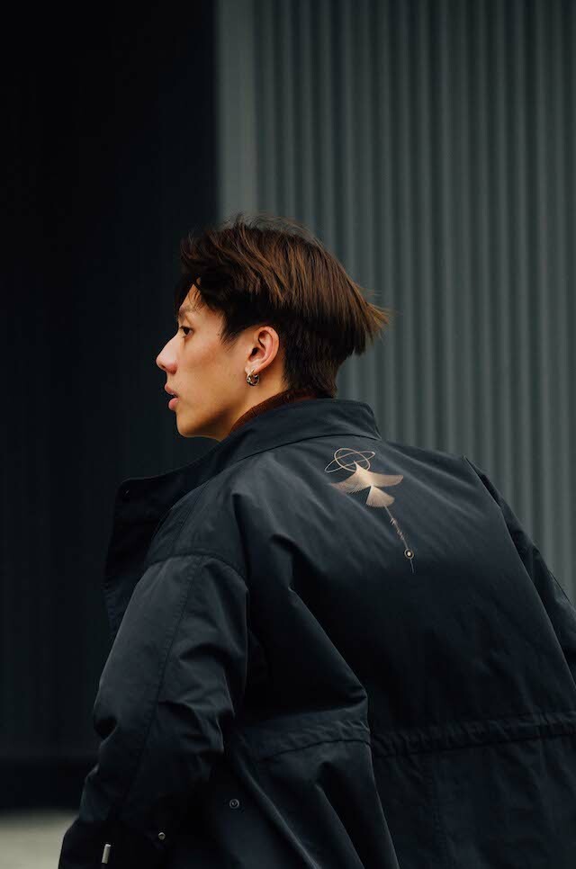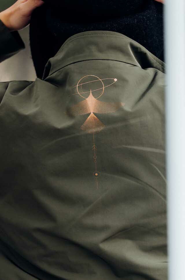 結合DIVIBER CLOTH機能面料與幾何的渡鴉圖形仿燙金印刷,